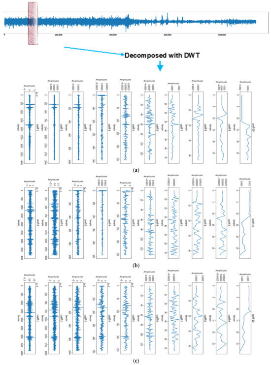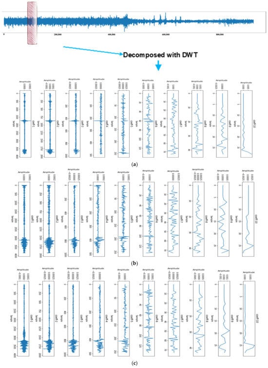 Coefficient Visualization with Seizure Signal. (a) CHB-MIT-EEG. (b) SSE-EEG. (c) TUH-EEG. We conducted an analysis on three datasets using the Daubechies wavelet 8 db. The figure shows the results for the seizure windows. For each frequency subband obtained through the Daubechies wavelet, we created separate subplots arranged in descending order of frequency content. Each subplot is labeled with the number of coefficients being plotted, while the x-axis is labeled as “Sample” and the y-axis as “Amplitude”.