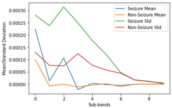 To extract features from the EEG signals, we applied wavelet transform and calculated the mean and standard deviation of the wavelet coefficients for two windows representing seizure and non-seizure signals, respectively. These features are visualized in Figure 7 to illustrate the distinctions between seizure and non-seizure EEG signals. Our findings indicate that the mean and standard deviation of the wavelet coefficients were higher for seizure EEG signals than for non-seizure EEG signals. This suggests that wavelet coefficients have potential as features for differentiating between seizure and non-seizure EEG signals.