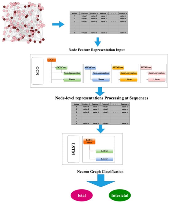 - Graph convolutional networks (GCNs) [35] are frequently utilized for learning data representations based on graphs. They could extract features from graph-based data and improve their representations by gathering information from the neighboring nodes in the graph. However, in scenarios where the graph data have temporal dynamics, such as time series or sequential data, RNNs such as LSTM [24,36] can be utilized to capture these dynamics. In this study, we propose a GCN-LSTM model that combines the strengths of both GCNs and LSTM to capture both the graph structure and temporal dynamics in the data. The GCN component extracts and enhances the graph-based features, while the LSTM component models the temporal dependencies in the data. To address the unbalanced nature of the dataset and improve classification accuracy, we utilize a balanced random forest (BRF) model [37] in conjunction with a GCN [35].