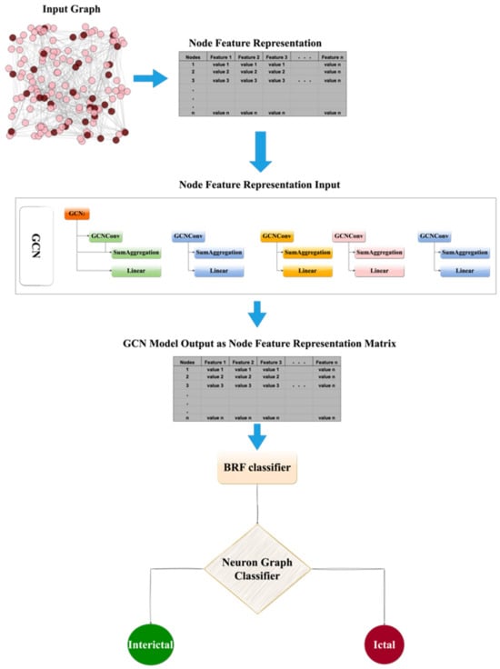 We employed deep learning techniques using EEG signals to create an advanced epileptic seizure detection system. Our goal was to distinguish between the non-seizure and seizure signals. Three epilepsy EEG datasets were utilized, and various features were extracted, including frequency-based attributes, statistical characteristics, and features obtained via the Daubechies wavelet transform. Combining wavelet and statistical features has proven to be highly effective in identifying epilepsy in EEG signals [49]. To represent these features effectively, we constructed a graph in which each feature served as a node and edges were established based on their Euclidean distance [10]. This graph was then trained using a combination of a GCN with LSTM and a GCN with BRF. The GCN processes node features and edges between nodes and refines node feature representations [50]. In the proposed models, the LSTM and BRF acted as node feature classifiers.
