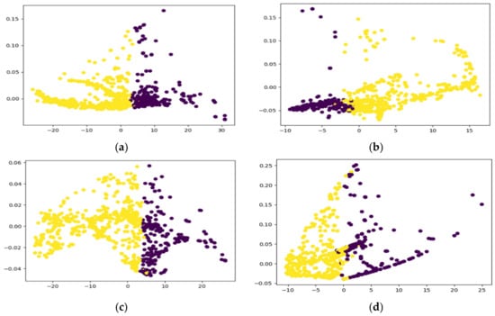 Final model performance. (a,b) demonstrate the node embeddings produced by the GCN-LSTM model on the CHB-MIT and SSE datasets, respectively. (c,d) depict the node embeddings generated by the GCN-BRF model on the CHB-MIT and SSE datasets, respectively. The embeddings were reduced to two dimensions using t-SNE, and each point represents a node in the dataset.