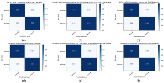 Figure 16 depicts the confusion matrices of the CHB-MIT, SSE, and TUH databases with the GCN-LSTM and GCN-BRF models. The matrices represent the model’s ability to correctly predict the true positive and true negative classes as well as the false positive and false negative classes.