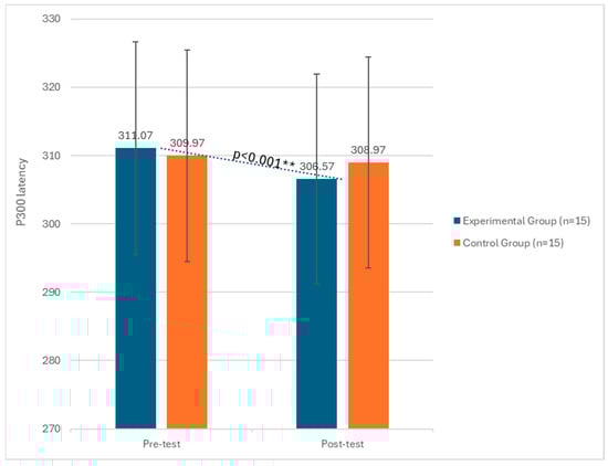 Changes in P300 latency between the pre-test and post-test phases in both the experimental and control groups. ** significant at p < 0.001.