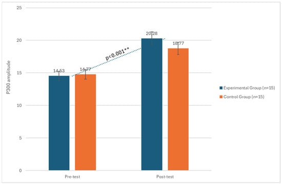 Changes in P300 amplitude between the pre-test and post-test phases in both the experimental and control groups. ** significant at p < 0.001.