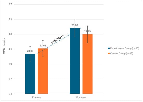 Changes in MMSE scores between the pre-test and post-test phases in both the experimental and control groups. ** significant at p < 0.001.