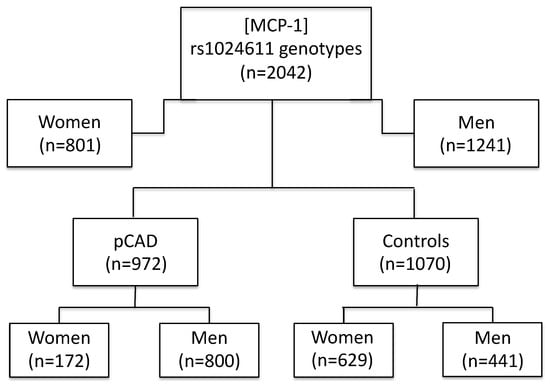 The study included 972 patients with pCAD and 1070 healthy controls, all belonging to the GEA Mexican Study (Figure 1). pCAD was defined when the individual presented with acute myocardial infarction, revascularization surgery, angioplasty, or coronary stenosis > 50% on angiography and when the diagnostic was made before the of age 55 years in men and before the age of 65 years in women. The control group was selected from subjects who went to the Institute’s blood bank for donation purposes, or from those who were invited to participate through posters or by direct invitation in social centers. This group included healthy individuals with no family or personal history of pCAD. A computed tomography scan of the chest and abdomen was performed on all participants. Coronary artery calcification (CAC) was defined using the Agatston method [22]. All individuals included in the control group had a CAC score equal to zero. Demographic, clinical, and biochemical parameters and lifestyle characteristics were assessed in all participants and defined as previously described [23,24,25].