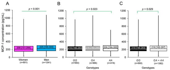 MCP-1 concentrations were similar in patients with pCAD [216 pg/mL (157–293)] and control individuals [218 pg/mL (169–289)] (p > 0.05). However, in the total group, men [225 pg/mL (165–300)] had higher concentrations of MCP-1 than women [208 pg/mL (151–284)] (p < 0.001) (Figure 2A). When stratifying MCP-1 concentrations by the genotypes of the rs1024611 polymorphism, individuals with the AA genotype [224 pg/mL (164–300)] presented higher concentrations than carriers of the GG genotype [210 pg/mL (156–283)] (p = 0.023) (Figure 2B). This difference remained significant when making the comparison considering the dominant model (GG vs. GA + AA) (p = 0.029) (Figure 2C). The distribution of the genotypes of the studied polymorphism was in the Hardy–Weinberg equilibrium.