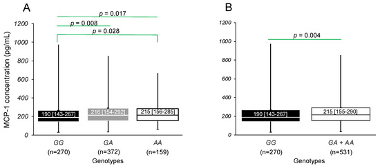 When performing the analysis separately in women and men, the differences remained significant in women. Carriers of the AA [215 pg/mL (156–285)] and GA [216 pg/mL (154–292) genotypes have higher MCP-1 concentrations when compared to carriers of the GG [190 pg/mL] genotype (p = 0.028 and p = 0.008, respectively) (Figure 3A). This difference remained significant under the dominant model (p = 0.004) (Figure 3B).