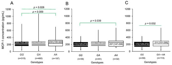 MCP-1 concentrations in patients with pCAD stratified by (A) the rs1024611 polymorphism of the MCP-1 gene, female patients stratified by (B) genotypes and (C) by the dominant model of the rs1024611 polymorphism of the MCP-1 gene. The study included 175 women with pCAD, and the MCP-1 concentrations and rs1024611 genotypes were determined in 172 of them. Data are shown as median [interquartile range]. Comparisons between groups were made with the Mann Whitney U or Kruskal–Wallis tests.