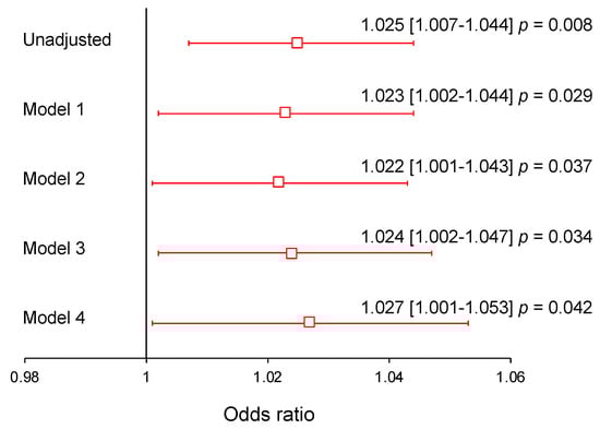 Considering that the rs1024611 AA genotype causes high concentrations of MCP-1, we evaluated whether, in carriers of this genotype, MCP-1 concentrations were associated with the presence of pCAD. The logistic regression analysis was adjusted by different models. Model 1 by age and sex, model 2 by age, sex, BMI, and smoking, model 3 by age, sex, BMI, smoking, LDL-cholesterol (LDL-C), and pattern B of LDL and model 4 by age, sex, BMI, smoking, LDL-C, LDL pattern B, hypertension and inflammation (C-reactive protein values > 3 mg/L) (Figure 5). In the model with the greatest adjustment (model 4), for every 10 pg/mL increase in MCP-1 concentration, the risk of presenting pCAD increases by 2.7% in individuals with the AA genotype.