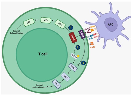 Intracellular mechanisms of CTLA-4 action in T lymphocytes. Activation of CTLA-4 inhibits T cell survival via three proposed mechanisms: (1) the inhibition of the RAS/MEK/ERK1/2 pathway by SHP2, (2) the inhibition of ZAP70 phosphorylation by SHP2, blocking the PI3K/AKT/mTOR pathway, (3) the direct inhibition of the PI3K/AKT/mTOR pathway by the YVKM motif. CTLA-4: cytotoxic T lymphocyte-associated antigen 4, CD80: cluster of differentiation 80, TCR: T cell receptor, MHC-II: major histocompatibility complex-II, CD28: cluster of differentiation 28, SHP2: Src homology region 2-containing protein tyrosine phosphatase 2, ZAP70: zeta-chain-associated protein kinase 70, PI3K: phosphoinositide 3-kinase, AKT: protein kinase B (PKB, also known as AKT), mTOR: mammalian target of rapamycin, MEK: mitogen-activated protein kinase/ERK kinase, ERK: extracellular-signal-regulated kinase.