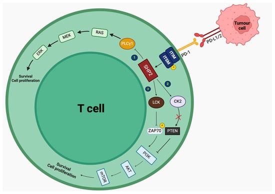 Intracellular mechanisms of PD-1 action in T lymphocytes. Activation of PD-1 decreases T cell proliferation by: (1) inhibiting PLCγ1, leading to the inhibition of the RAS/MEK/ERK1/2 pathway, (2) acting on LCK, inhibiting the phosphorylation of ZAP70 and the activation of the PI3K/AKT/mTOR pathway, and (3) acting on CK2, leading to the phosphorylation of PTEN (presented with an x), inhibiting the PI3K/AKT/mTOR pathway. PD-1: programmed-death 1, PD-L1: programmed death-ligand 1, ITIM: immunoreceptor tyrosine-based inhibitory motif, ITSM: immunoreceptor tyrosine-based switch motif, SHP2: Src homology region 2-containing protein tyrosine phosphatase 2, LCK: lymphocyte-specific protein tyrosine kinase, ZAP70: zeta-chain-associated protein kinase 70, PI3K: phosphoinositide 3-kinase, AKT: protein kinase B (PKB, also known as AKT), mTOR: mammalian target of rapamycin, CK2: casein kinase 2, PTEN: PLCγ1: phospholipase C gamma 1, MEK: mitogen-activated protein kinase/ERK kinase, ERK: extracellular-signal-regulated kinase.