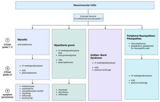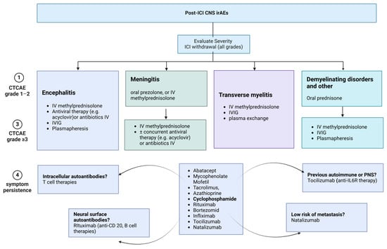 In refractory or relapsing cases, escalation to second-line therapies is prudent and includes options such as abatacept, mycophenolate mofetil, tacrolimus, azathioprine, cyclophosphamide, rituximab, bortezomib, infliximab, tocilizumab, and natalizumab. The optimal choice should be guided by the presumed pathophysiological mechanism of the disorder and an individual’s comorbidities []. Figure 4 and Figure 5 summarize the recommended management of common neurological irAEs.