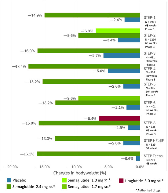 - Rubino, D.; Abrahamsson, N.; Davies, M.; Hesse, D.; Greenway, F.L.; Jensen, C.; Lingvay, I.; Mosenzon, O.; Rosenstock, J.; Rubio, M.A.; et al. Effect of Continued Weekly Subcutaneous Semaglutide vs Placebo on Weight Loss Maintenance in Adults With Overweight or Obesity: The STEP 4 Randomized Clinical Trial. JAMA 2021, 325, 1414–1425. [Google Scholar] [CrossRef] [PubMed]
