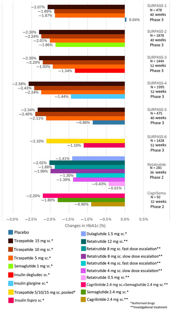 - McDermid, E. A Quick Guide to the SURPASS and SURMOUNT Trials. Available online: https://diabetes.medicinematters.com/en-GB/tirzepatide/type-2-diabetes/a-quick-guide-to-the-surpass-and-surmount-trials/18478154 (accessed on 27 March 2024).