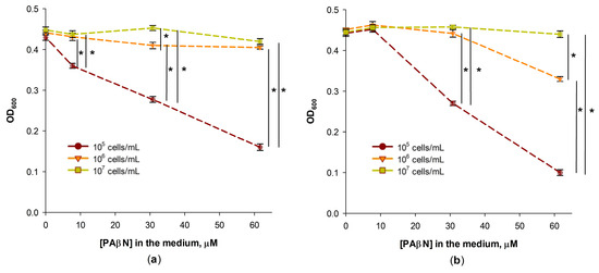 Effect of the initial concentration of S. Typhimurium cells on their growth in chloramphenicol (a) or tetracycline (b) containing LB medium in the presence of PAβN. The antibiotics were added to the final concentration of 0.25 mg/L, and the initial concentrations of cells are indicated in the figure. The cells were grown overnight in 96-well plates at 37 °C. Three biological replicates were performed for each set of experiments; *—p < 0.05.