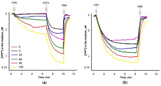 In the subsequent series of experiments, we delved into the impact of varying PAβN concentrations on the accumulation of TPP+ within S. Typhimurium cells using an ion-selective electrode, enabling the monitoring of the concentration of this lipophilic cation in the incubation medium (Figure 2). Cells with an intact OM exhibited a discernible TPP+ accumulation when exposed to PAβN concentrations exceeding 24 μM (Figure 2a). In contrast, a distinct and more pronounced accumulation of TPP+ by the cells was observed when Tris/EDTA-permeabilized cells were studied (Figure 2b). Even at a considerably lower PAβN concentration of 3 μM, these cells exhibited an augmented TPP+ accumulation (Figure 2b). The supplementation of EDTA to the medium induced an additional uptake of TPP+ by the cells with an intact OM (Figure 2a). In both cases, the increasing concentration of the efflux inhibitor in the medium resulted in a proportional increase in TPP+ uptake.