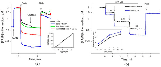 Binding of PAβN to S. Typhimurium cells (a) and LPS (b). The experiments were performed in 5 mL of 100 mM Tris-HCl, pH 8.0, at 37 °C. In (a) PAβN was added to the final concentration of 2 μM (Nerstian slope of the electrode is presented in the insert). The concentrated cell suspension was added to obtain OD600 of 1. Glucose and Polymyxin B (PMB) were added to the final concentrations of 0.1% and 50 mg/L, correspondingly. In (b) LPS additions are shown by the arrows. Numbers indicate the final concentrations of LPS after each of the additions. PMB was added to the final concentration of 50 mg/L, EDTA—to 0.1 mM. Insert shows the relationship between the amount of LPS added and the amount of PAβN bound.