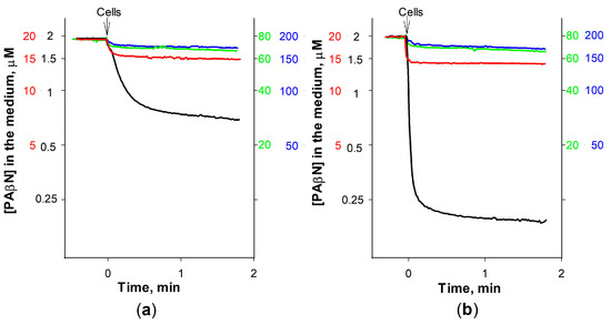 Effect of the initial concentration on PAβN binding to S. Typhimurium cells without EDTA (a) and in the medium contained 0.1 mM EDTA (b). The experiments were performed in 5 mL of 100 mM Tris-HCl, pH 8.0, at 37 °C. The initial PAβN concentration was 2 μM (black), 20 μM (red), 80 μM (green), or 200 μM (blue curves and scales). Arrows indicate the additions of cells.
