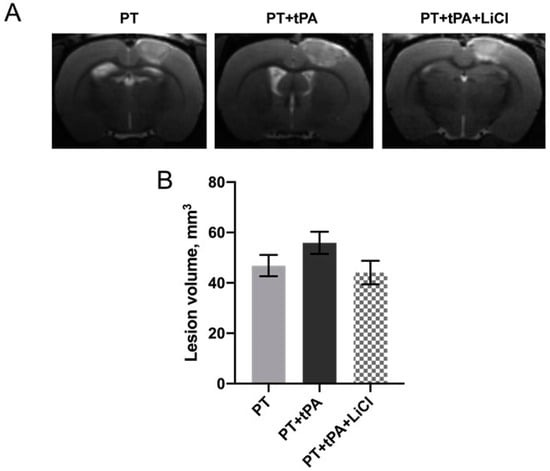 Evaluation of the neuroprotective effect of concurrent thrombolytic therapy with LiCl on the severity of brain damage on the 7th day after PT in rats. (A) Representative brain section obtained by T2-weighed MRI (image covered the center of ischemic area). Hyperintensive regions refer to ischemic areas. (B) Volume of brain lesions caused by PT in the PT evaluated by using MRI with analysis of T2-weighted images. No significant difference between the groups was found (one-way ANOVA test). The data are presented as mean ± SEM.