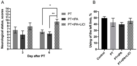 (A) Neurological status scores estimated in the limb-placing test (3rd and 6th days after the PT). The data are presented as mean ± SEM. *—p ≤ 0.05 in PT vs. PT + tPA + LiCl, **—p ≤ 0.005 in PT + tPA vs. PT + tPA + LiCl group on day 6 (two-way ANOVA test). (B) PT-induced limb asymmetry measured in the cylinder test on the 7th day after the surgery. The data are presented as mean ± SEM.