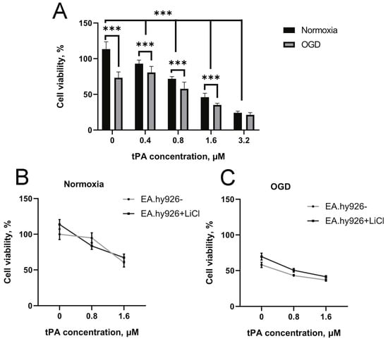 Survival of EA.hy926 cells exposed to increasing concentrations of tPA. (A) Toxicity of tPA in normoxia. Effect of LiCl pretreatment on tPA-induced cell death in normoxia (B) or after OGD (C). The data are presented as mean ± SEM ***—p ≤ 0.001 (two-way ANOVA test). Viability of control cells was taken as 100%.