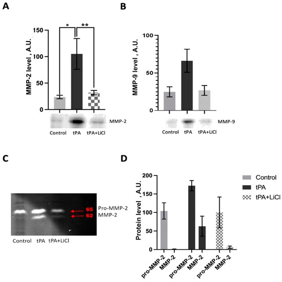 MMP levels in EA.hy926 endotheliocytes treated with 1.6 µM tPA and 1 mM LiCl. The content of MMP-2 (A) and MMP-9 (B) measured by Western blotting (One-way ANOVA test). Representative images and densitometry analysis of the signal intensity are presented. Representative zymogram for MMP-2 activity (C) and its densitometry (D) (two-way ANOVA test). The data are presented as mean±SEM. *—p ≤ 0.05, **—p ≤ 0.005.