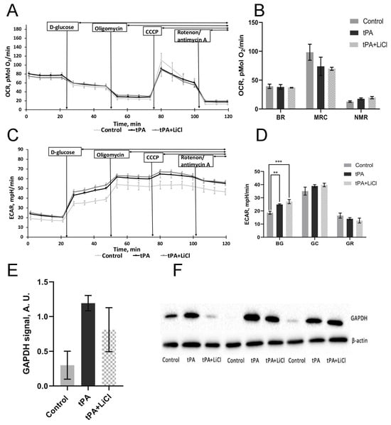 Effect of tPA on glycolysis and respiration of EA.hy926 cells. Effects of tPA and LiCl on oxygen consumption rate (OCR) curves (A) and respiratory parameters (B): basal respiration (BR), maximal respiration capacity (MRC), and non-mitochondrial respiration (NMR). (C) Effects of tPA and LiCl on extracellular acidification rate (ECAR). OCR and ECAR of EA.hy926 (A,C) were measured after sequential addition of D-glucose (10 mM), ATP synthase inhibitor oligomycin (4.5 μM), carbonyl cyanide m-chlorophenyl hydrazone (CCCP) (10 μM), and a mixture of rotenone and antimycin A (2.5 and 4 μM, respectively). (D) Glycolytic parameters: basal glycolysis (BG), glycolytic capacity (GC), and glycolytic reserve (GR). (E,F) GAPDH content in endothelial cells measured by Western blotting (One-way ANOVA tests). The data are presented as mean ± SEM. **—p ≤ 0.005, ***—p ≤ 0.001.