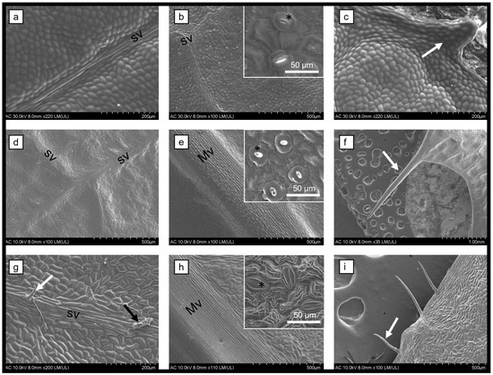 Scanning electron microscopy micrographs of the leaves of B. vulgaris (a–c), M. aquifolium (d–f), and P. amurense (g–i) showing the upper epidermis (a,d,g), the lower epidermis (b,e,h), and the margins (c,f,i); Mv = midvein; sv = secondary vein; white arrow = protuberance/tector trichome; black arrow = secretory trichome; * = stomata.