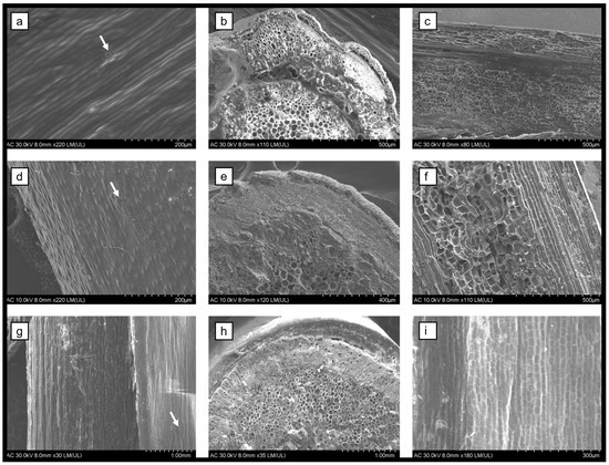 Scanning electron microscopy micrographs of the stems of B. vulgaris (a–c), M. aquifolium (d–f), and P. amurense (g–i) showing the surfaces (a,d,g), the cross-sections (b,e,h), and the longitudinal sections (c,f,i) of the stems with stomata distributed randomly (white arrow) and normal aspect of the vascular bundles.