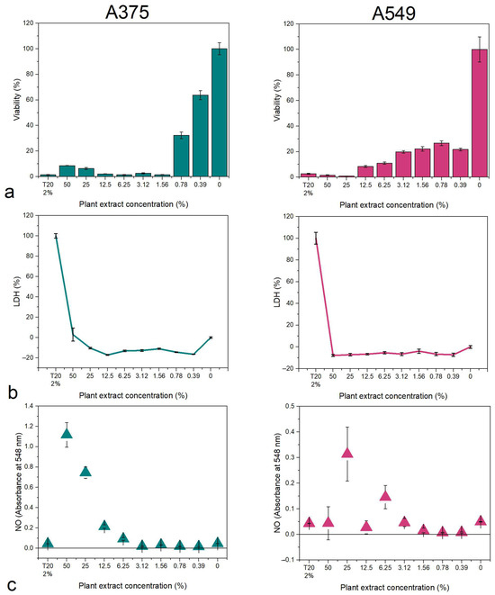 Cytotoxicity of the B. vulgaris extract on A375 skin melanoma and A549 lung adenocarcinoma: (a) MTT viability assay; (b) LDH membrane integrity assay; (c) NO Griess assay. T20 = Tween 20 negative control.
