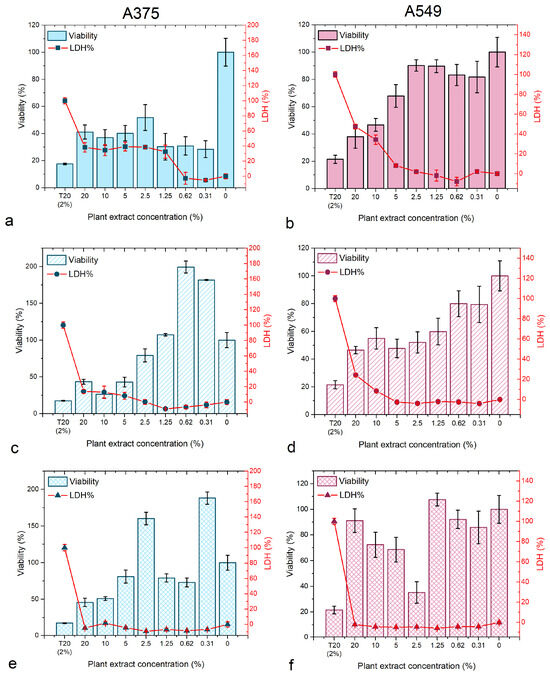 Viability and membrane integrity (LDH% release) of B. vulgaris (a,b), M. aquifolium (c,d), and P. amurense (e,f) plant extracts on A375 and A549 spheroids.
