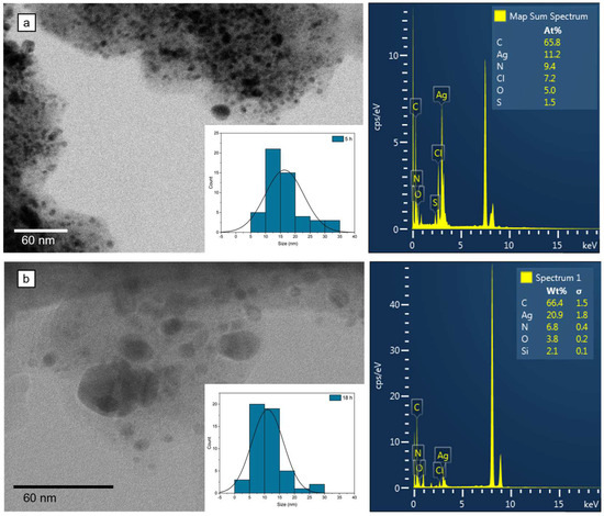 Transmission electron micrographs and EDX spectra of Ag nanoparticles synthesized with B. vulgaris plant extract for 5 h (a) and 18 h (b). It can be observed that nanoparticles can be formed after 5 h of incubation with the plant extract, with a wider size distribution (insets) compared with 18 h of incubation.
