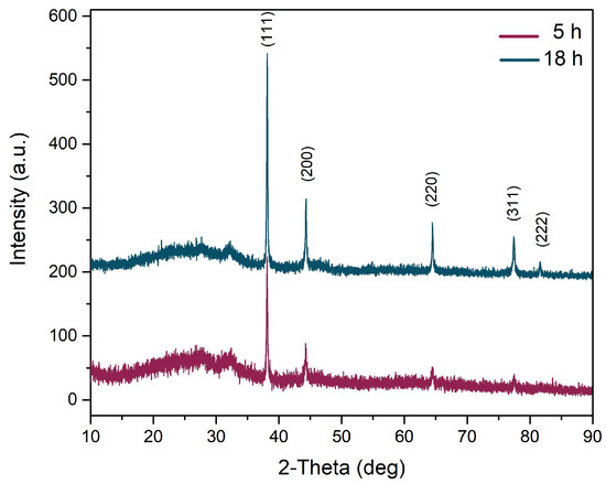 The crystallinity of the nanoparticles was confirmed by XRD analysis (Figure 9). Both samples had four distinct diffraction peaks at 2θ values that corresponded to the reflection planes of (111), (200), (220), and (311), characteristic of the face-centered cubic structure of silver. However, the samples obtained after 18 h had a distinct peak at (222) as well (reference file PDF card no. 03-065-8428).