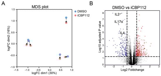 To assess the role of P300/CBP in T cell activation, primary human CD4+ T cells from five different donors were treated with the P300/CBP-specific inhibitor iCBP112 for 1 h prior to stimulation using anti-CD3/CD28 coated beads for 16 h. Next-generation RNA sequencing was performed on these cells to evaluate the transcriptome-wide expression of mRNA. Treatment with the P300/CBP inhibitor resulted in 2562 significantly (FDR < 0.05) differentially expressed genes (DEs), of which 1276 genes were downregulated following treatment with iCBP112 (Figure 1A,B). Many of the downregulated genes are associated with immune regulation, including interleukins, chemokines, and CD markers (Figure 1C). More specifically, pathway analysis revealed that P300/CBP inhibition impaired the expression of genes associated with processes involved in cytokine signaling (Figure 1D–F). These findings indicate that the inhibition of P300/CBP results in reduced T cell activation, as indicated by impaired cytokine production.