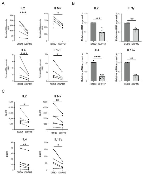 iCBP112-mediated inhibition of key proinflammatory cytokine expression. (A) Normalized RNA expression (counts per million, CPM) of IL2, IFNγ, IL4, and IL17α genes extracted from the RNA-sequencing dataset following iCBP112 treatment. (B) Relative mRNA expression of IL2, IFNγ, IL4, and IL17α as measured by quantitative polymerase chain reaction (qPCR). (C) Quantitative analysis of IL-2, IFN-γ, IL-4 and IL-17α protein expression measured by Luminex. p-values were calculated using a paired t-test, n = 6, ns: not significant, *: p < 0.05, **: p < 0.01, ***: p < 0.005, ****: p < 0.001.