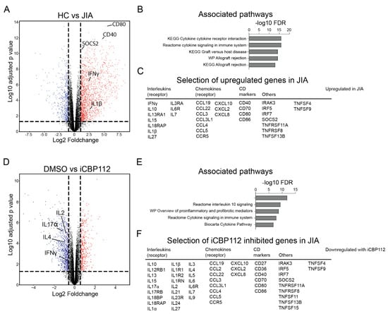 The administration of iCBP112 one hour prior to the 16 h activation of CD4+ T cells from JIA patients resulted in significant transcriptional changes with 6189 DE genes (FDR < 0.05), of which 3267 genes were significantly downregulated after treatment (Figure 3D–F and Figure A1A). Consistent with what was observed in healthy control cells, many of the DE genes were associated with pathways related to cytokine signaling (Figure 3E). Notably, we found that pathways that were increased in cells from JIA compared to healthy controls were inhibited by iCBP112 treatment, implying that P300/CBP inhibition preferentially reduces the expression of JIA-associated genes. To confirm this, we performed gene set enrichment for genes inhibited by iCBP112 (foldchange < 0.5, FDR < 0.05) in the dataset comparing JIA with healthy control cells (Figure 3G). Indeed, we identified that genes inhibited by iCBP112 were significantly enriched in the set of genes that are upregulated in JIA. Moreover, out of all the genes significantly inhibited by iCBP112, 429 genes were significantly upregulated in JIA and were notably associated with cytokine signaling pathways, among others (Figure 3H). Further analysis revealed that the treatment of JIA cells with iCBP112 resulted in a significant decrease in the expression of proinflammatory cytokines IL2, IL4, IFNγ, and IL17α (Figure 3I and Figure A1B). In summary, treatment of JIA patient-derived CD4+ T cells with iCBP112 induced transcriptional changes, downregulated immune-related pathways, and reduced the expression of JIA-associated genes. These findings suggest the therapeutic potential of iCBP112 for JIA.