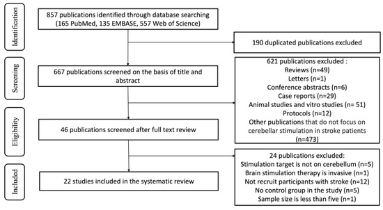 Among these articles, 148 were excluded due to their type, and another 473 were excluded because their topics were irrelevant, such as having unrelated intervention therapies (for example, acupuncture, and conventional physiotherapy) and unrelated outcomes (like changes in brain area activity and perfusion). The remaining 46 full-text articles were then reviewed in their entirety, and ultimately 22 clinical studies specifically concerning the use of cerebellar NIBS in stroke rehabilitation were assessed for eligibility for inclusion in this systematic review (Figure 1).