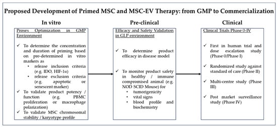 Ethical concerns regarding MSCs and their EVs have largely been addressed by using discarded tissues such as umbilical cords. However, it is crucial to obtain written informed consent, ensure transparency about the use and handling of donated samples, and protect donor confidentiality at all times. The European Medicines Agency classifies MSCs and their EVs as Advanced Therapeutic Medicinal Products (ATMPs) (Advanced therapy medicinal products, https://www.ema.europa.eu/en/human-regulatory-overview/advanced-therapy-medicinal-products-overview (accessed on 17 May 2024)), while the US Food and Drug Administration categorizes them as Cell & Gene Therapy Products (CGTPs) (Framework for the Regulation of Regenerative Medicine Products, https://www.fda.gov/vaccines-blood-biologics/cellular-gene-therapy-products/framework-regulation-regenerative-medicine-products (accessed on 17 May 2024)). While jurisdiction in emerging countries may still be in its infancy, most developing regulators will adopt the guidelines from these mature agencies. The primary concern in the regulation of medicinal products is safety besides their purity and quality. In general, the safety of these products after extensive expansion and manipulation must be assessed. In addition to incorporating a potency or functional assay, there is also a need to rule out tumorigenicity and abnormal karyotype for the MSCs. To minimize off-target effects, it is recommended to measure known markers for side effects, such as apoptotic or senescent markers and inflammatory markers, in MSCs and their EVs as exclusion release criteria. Such safety concerns may be heightened after cell priming due to the pre-stimulated state and increased potency of MSCs or their EVs. Since IFN-γ is a potent inducer of immune cell proliferation, the safety of its residual amount in primed MSCs and in the EV cargo that is administered should be established. A cut-off level for the residual IFN-γ and in the EV cargo needs to be ascertained before release. Additionally, it is essential to source clinical and GMP-grade IFN to ensure quality and consistency for priming.