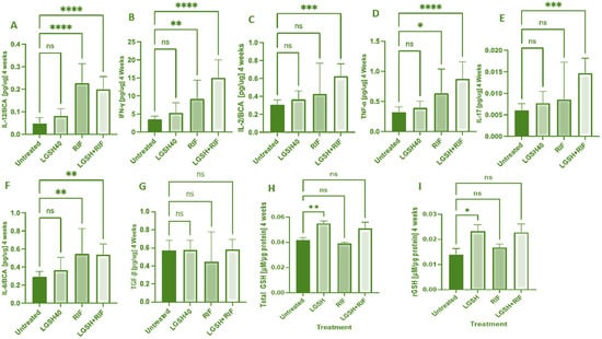 At 8 weeks, all treatments showed a decrease in IL-12, IFN-γ, IL-2, TNF-α, IL-17, IL-6, TGF-β, and GSH production (Figure 2). LGSH40 treatment resulted in a significant decrease in IL-12, IFN-γ, IL-2, TNF-α, IL-17, and IL-6 production compared to untreated mice at 8 weeks post-infection (Figure 2A–F). LGSH40 treatment resulted in a significant increase in TGF-β and the total and reduced GSH production compared to untreated mice at 8 weeks post-infection (Figure 2G–I). RIF treatment resulted in a significant decrease in IFN-γ, IL-2, IL-17, and IL-6 production compared to untreated mice at 8 weeks post-infection (Figure 2B,C,E,F). LGSH+RIF resulted in a significant decrease in IL-12, IFN-γ, IL-2, TNF-α, IL-17, and IL-6 production compared to untreated mice at 8 weeks post-infection (Figure 2A–F). LGSH+RIF resulted in a significant increase in reduced GSH (rGSH) compared to untreated mice at 8 weeks post-infection (Figure 2I). When compared to the lone RIF group, mice treated with L-GSH+RIF had a higher increase in the levels of reduced forms of GSH (Figure 2I) and a further diminishment in the levels of IL-12, IFN-γ, IL-2, TNF-α, IL-17, and IL-6 (Figure 2A–F).