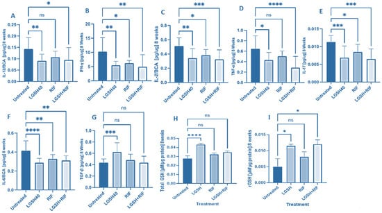Levels of IL-12 (A), IFN-γ (B), IL-2 (C), TNF-α (D), IL-17 (E), IL-6 (F), TGF-β (G), total GSH (H), and rGSH (I) in liver lysates of M. tb-infected mice at 8 weeks post-infection. We used GraphPad Prism Software 8 for statistical analysis. The graphs show the values of the mean ± standard deviation for each group, with n = 6 per group per time point. One-way ANOVA was utilized in analyzing the data for multiple groups. p-values of <0.05 (*), <0.01 (**), <0.005 (***), and <0.0001 (****) were considered significant. p-values of >0.05 were considered not significant (ns). The results shown are an average of six mice.