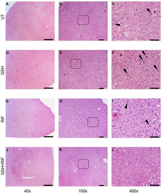 Histopathology of the livers of untreated and treated M. tb-infected db/db mice at 4 weeks post-infection/treatment. (A–C) Untreated (UT); (D–F) glutathione-treated (GSH); (G–I) rifampicin-treated (RIF); (J–L) glutathione plus rifampicin-treated (GSH+RIF). Images (A,D,G,J) are at 40× magnification; (B,E,H,K) are 100× magnification; (C,F,I,L) are 400× magnification. Arrowheads indicate pyknotic nuclei, and * refers to the hepatic veins with various levels of disorganization. The dotted rectangles in (B,E,H,K) refer to the enlarged sections shown in (C,F,I,L), respectively. The scale bar in (A,D,G,J) is 500 µm; (B,E,H,K) is 100 µm; (C,F,I,L) is 50 µm.