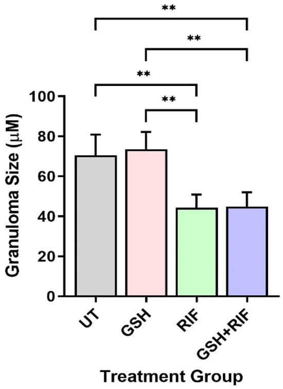 Granuloma size in the livers of untreated and treated db/db mice infected with M. tb at 8 weeks post-infection. UT: untreated; GSH: glutathione-treated; RIF: rifampicin-treated; GSH+RIF: glutathione plus rifampicin-treated. Data from 4 animals per group. ** p < 0.01 as determined by one-way ANOVA with Tukey’s post-correction.