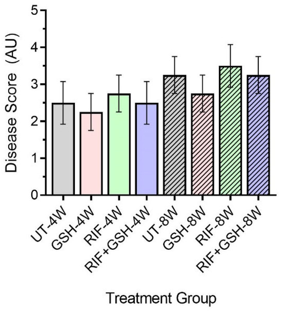 Disease score of livers in untreated and treated db/db M. tb-infected mice. UT: untreated; GSH: glutathione-treated; RIF: rifampicin-treated; GSH+RIF: glutathione plus rifampicin-treated—data from 4 animals per group. No statistically significant differences were noted between groups; data were analyzed by one-way ANOVA with Tukey’s post-correction.