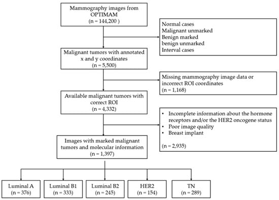 This study used mammography images from the OPTIMAM imaging database (OMI-DB) [17,18]. The inclusion criteria required images provided with complete and proven information on the molecular type of breast cancer (based on estrogen and progesterone receptors and the HER2 oncogene), as well as the coordinates of the region of interest (ROI) around the respective tumor. The final dataset of 660 patients (mean age: 67.9 ± 7.7), corresponding to 1397 images of malignant breast tumors of the five pre-defined subtypes: 376 Luminal A, 333 Luminal B, 245 Luminal B2, 154 HER2 and 289 TN, as can be seen in Figure 1.