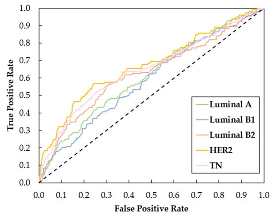 The multi-class classification aimed to identify the exact molecular subtype among the five categories: Luminal A, Luminal B1, Luminal B2, HER2, and TN. The results (Table 5) showed a more complex scenario compared to the binary classification due to the increased difficulty of the task, as the focus is not only one positive and negative class. For example, for the binary approach, the higher AUC values for Luminal A, Luminal B1, Luminal B2, HER and TN were 65.99, 65.45, 65.30, 73.31 and 64.45, respectively. When doing the multi-class classification, these values drop to 61.01, 59.81, 59.91, 73.14 and 64.27. Those differences were statistically significant in: Luminal A and Luminal B1 with oversampling and DA; Luminal B2 with undersampling and DA; and HER2 using imbalanced data without DA. Only in the latter did multi-classification outperform binary classification. Once again, the HER2 subtype classification highlights from the rest, with its superiority quite visible in the ROC curves in Figure 4.