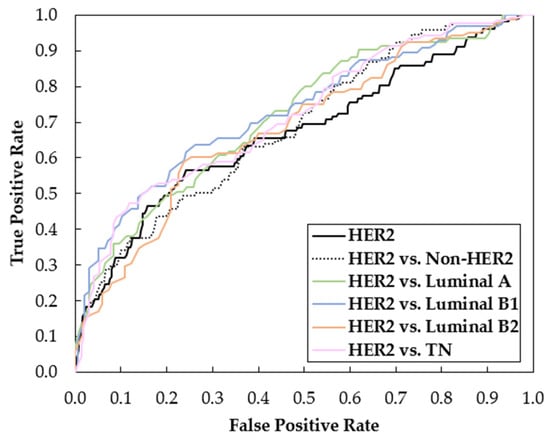 Given the promising results for the discrimination of the HER2 subtype, the ROC curves obtained for classifications in which it is involved are represented in Figure 5 (HER2 vs. Non-HER2 from the binary classification of Section 3.1, HER2 from the multi-class classification of Section 3.2 and HER2 vs. each molecular subtype obtained in this section).