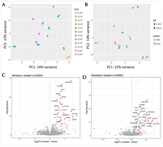 Principal component analysis (PCA) and volcano plot of differentially regulated transcripts. (A). PCA plot of RNA-seq data show the characteristics of samples according to gene expression levels. Each dot indicates an individual sample; the same color indicates samples from the same individual, whether treated or untreated with 1 µM RG7388 for 6 h. The score plots display each sample in the dataset with respect to the first two principal components and can therefore be used to interpret the relations among the samples. This information can be used to identify outliers. The samples belonging to the same CLL patient (either treated or untreated) show a high similarity with respect to the first two principal components, and a much greater variance between samples. (B). There was no clear separation into RG7388-resistant and -sensitive groups for either control (DMSO) or treated patient samples. (C,D). Volcano plots of altered gene expression profiles for RG7388-sensitive (C) and -resistant (D) CLL samples after drug treatment. A Benjamini–Hochberg-corrected significance value of <0.05 was used as a cut-off. The red dots represent significantly up- or downregulated genes (|log2 FC| ≥ 1 and FDR < 0.05), and the gray dots represent non-significant gene expression changes (|log2 FC| < 1 and/or FDR ≥ 0.05). FC: fold change; FDR: false discovery rate.