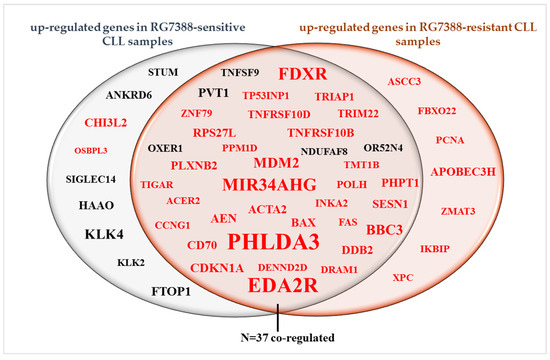 Venn diagram showing upregulated genes that are expressed jointly or only in sensitive or resistant subgroups. Upregulated genes after treatment with 1 µM RG7388 for 6 h in CLL patient samples either sensitive (left) or resistant (right) to RG7388 are shown. Thirty-seven genes were co-regulated in both groups, while seven genes were upregulated only in the resistant CLL cells. Differentially expressed genes had adjusted p-values < 0.05. Genes with a low normalized count value (< 50) and an expression fold change lower than 1.5 were excluded. Direct p53 transcriptional targets [10,11] are shown in red. The font size is used to indicate the relative level of fold change.
