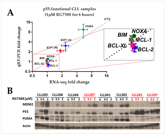 (A). Correlation between RNA-seq and qRT-PCR. Correlation plots indicating the relationship between qRT-PCR results (fold change; y-axis, n = 7 samples) for 7 selected genes and the corresponding data from RNA-seq analysis (fold change; x-axis, n = 12 samples). RNA samples were extracted separately for RNA-seq and qRT-PCR. E2F7 expression change is shown separately for the primary CLL samples that are sensitive (S) or resistant (R) to RG7388. A statistically significant Pearson correlation was found between the expression levels measured using qPCR and RNA-seq (p < 0.0001). Bars represent standard error. (B). Western blot analysis showing representative examples of concentration-dependent PUMA protein induction by ex vivo treatment of CLL samples with RG7388 for 24 h (CLL265 and CLL268). Two examples of non-functional p53 stabilization with minimal downstream PUMA expression are included (CLL281 and CLL297) together with one example of high basal PUMA expression, which is further increased by RG7388 (CLL302). RG7388-resistant CLL samples are indicated in red.